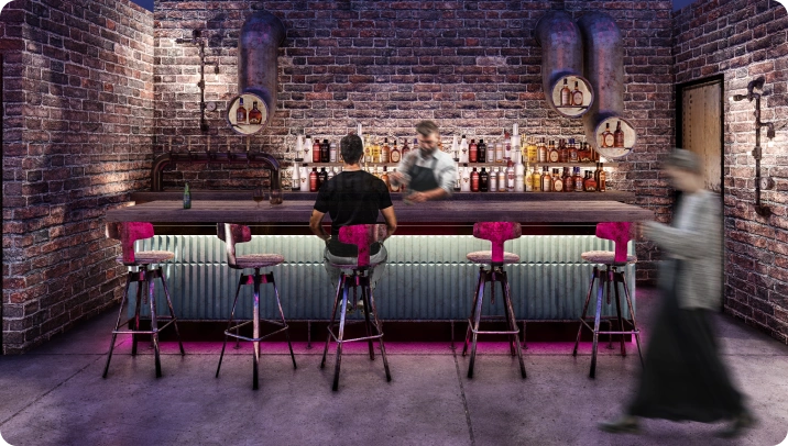 Located in such a competitive area, it was crucial to offer a novel experience to users strolling along Boulevard San Ramón at night. In the context of a complete street renovation, we chose a concept of reclaimed space. We enhanced the attributes of the building, even before the renovation, to achieve the desired disruptive style. Elephant stands out for not appearing as a brand-new establishment with flawless finishes. Under the restoration concept, we created a connection with the memory of users who knew the San Ramón passage before the renovation.
