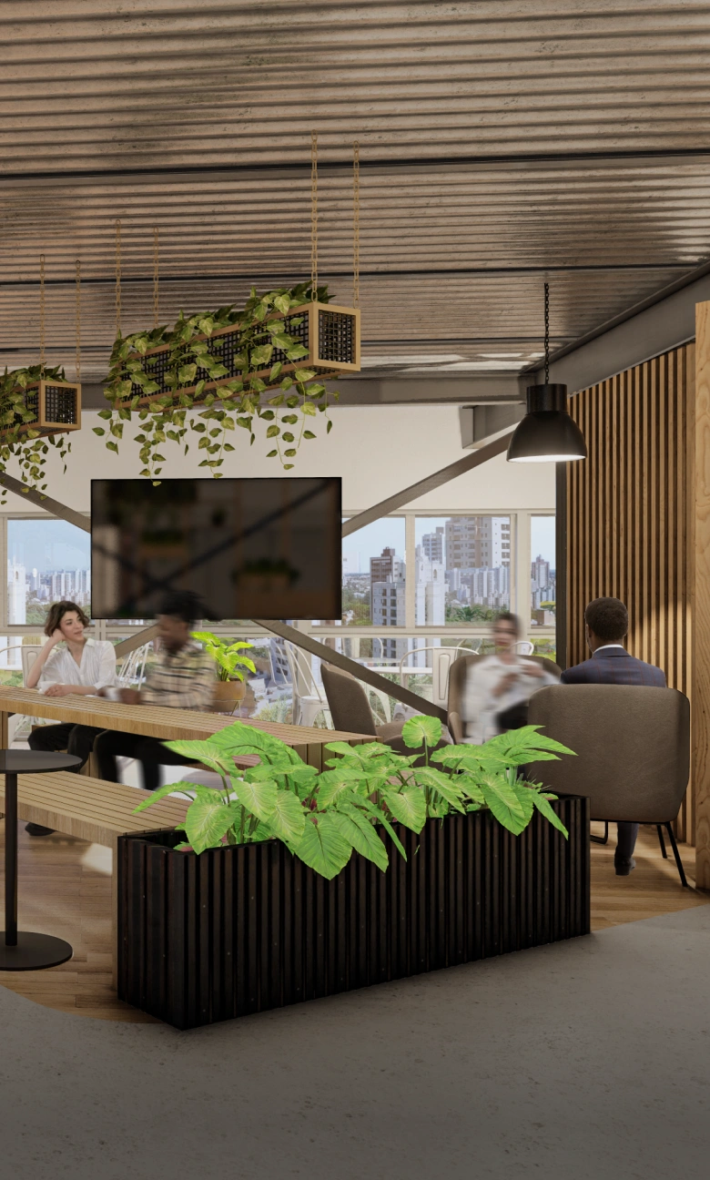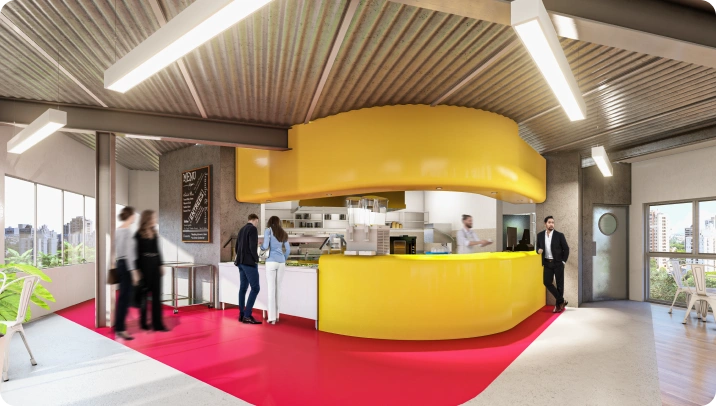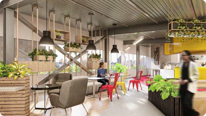Rediseñamos la cafetería, creando una distribución orgánica inspirada en la naturaleza para ofrecer distintos espacios para reunirse, descansar y socializar.