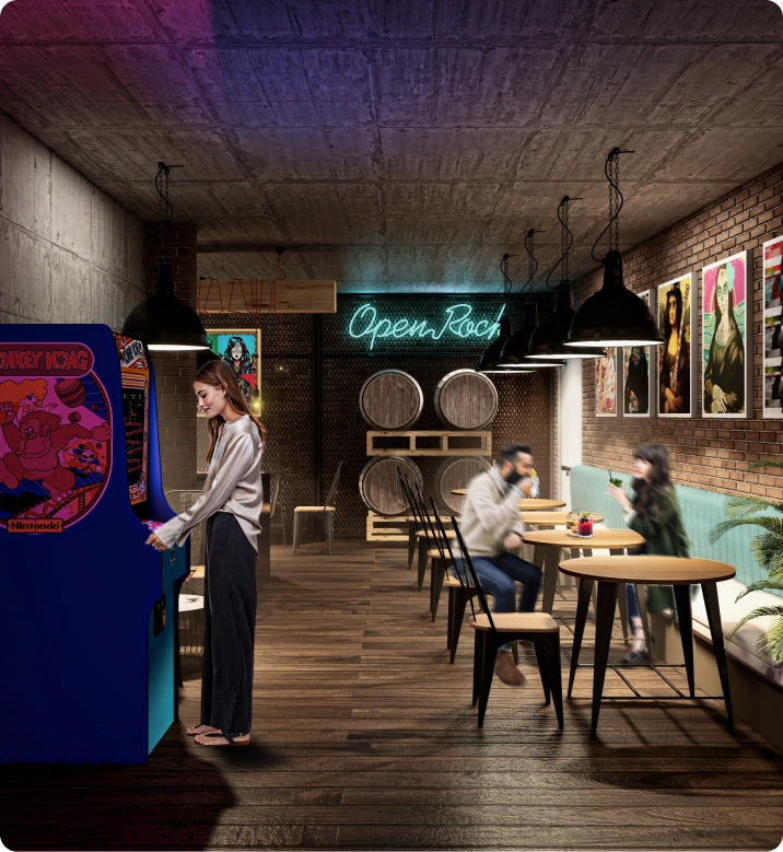 Nivel 3 – Urbanismo neoyorquino con alma verde: Ladrillos expuestos, iluminación tenue y materiales naturales que equilibran lo industrial con lo orgánico, evocando la vida urbana con un toque de calma.