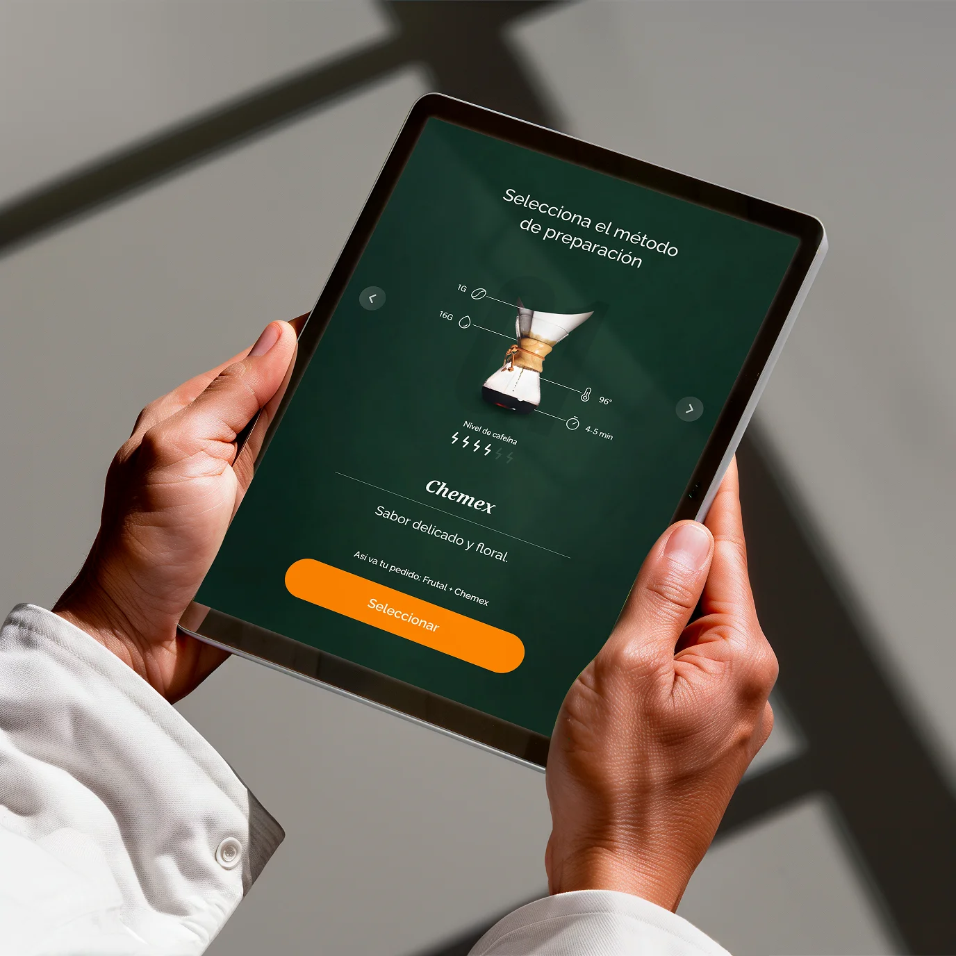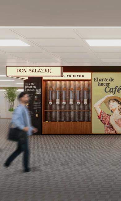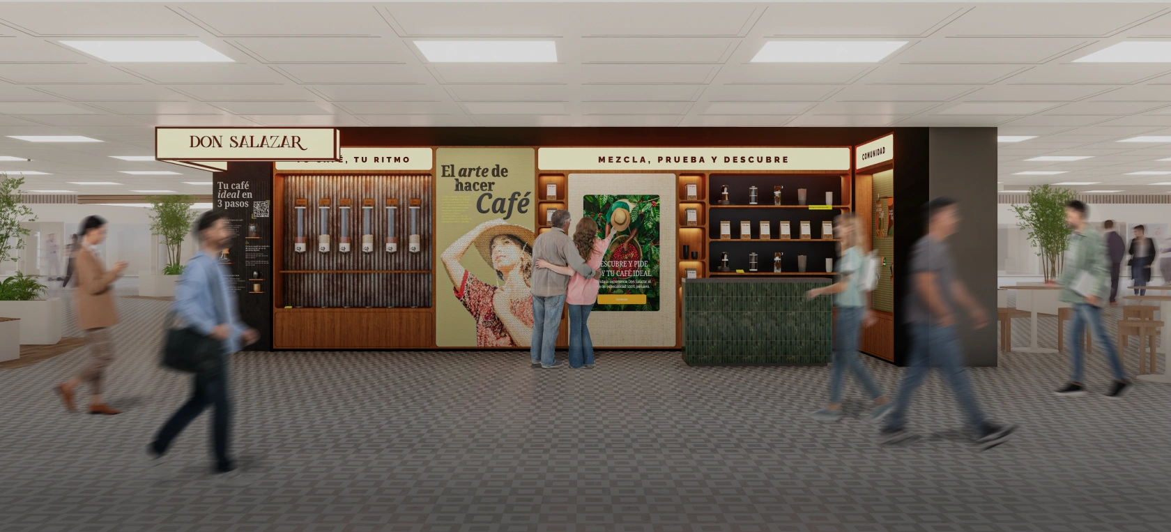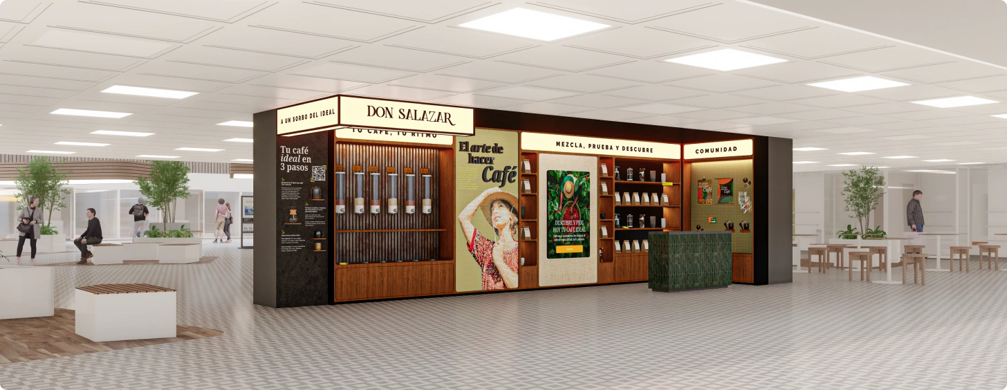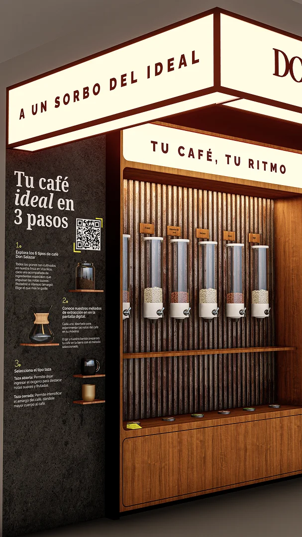 Diseño de experiencia de un espacio con 14.8 m² que conecta puntos de contacto físicos y digitales para ayudar a cada usuario a descubrir su café ideal.