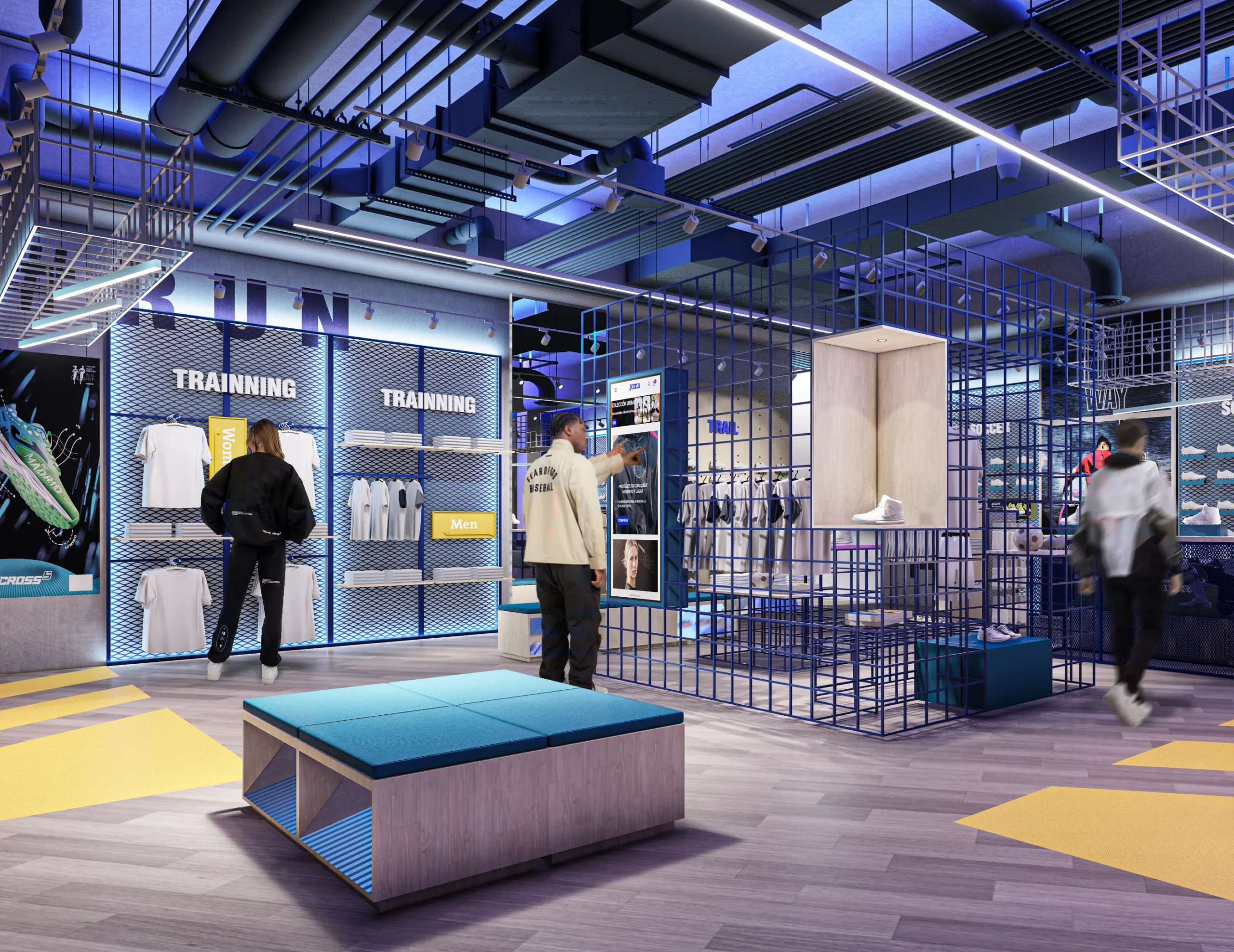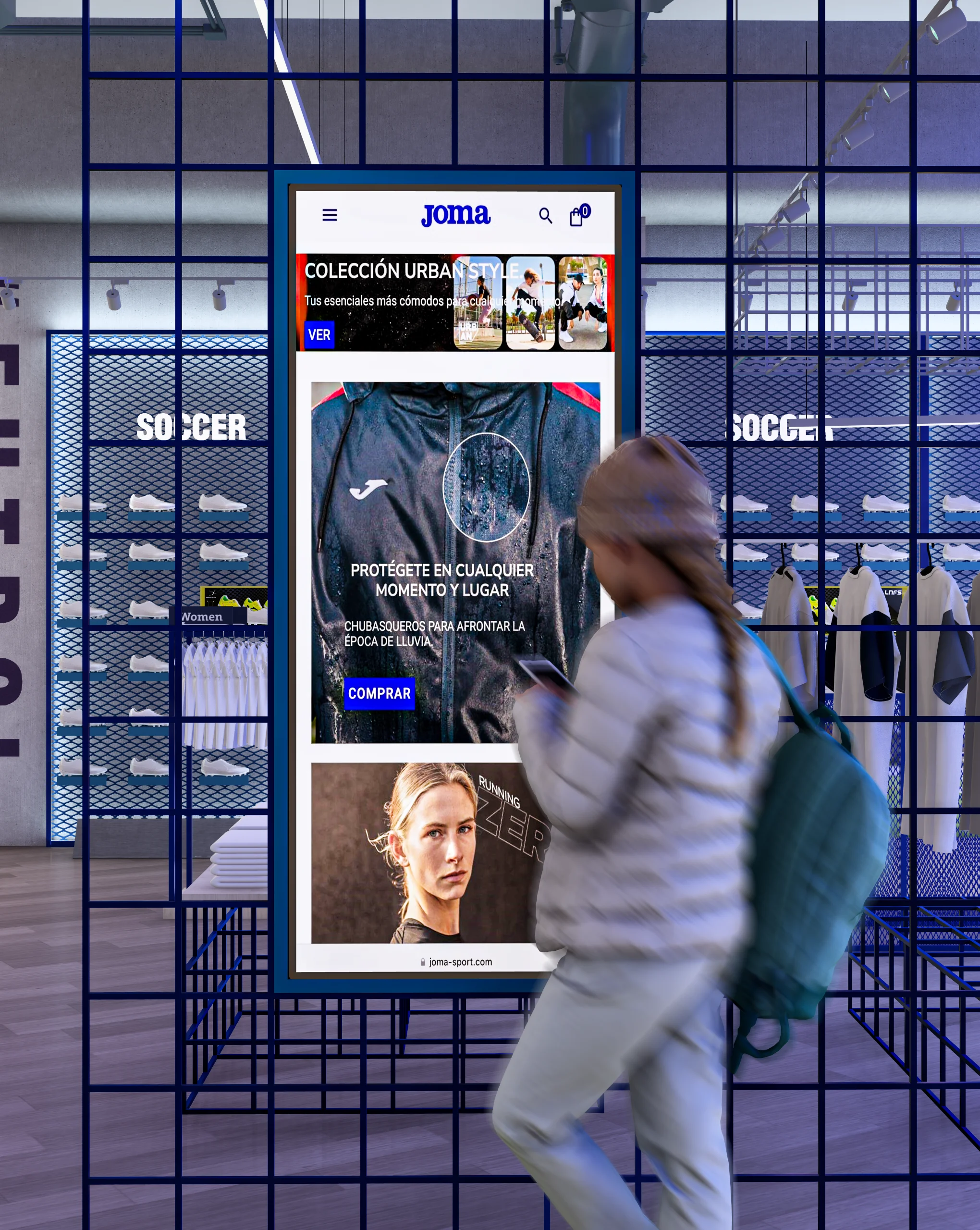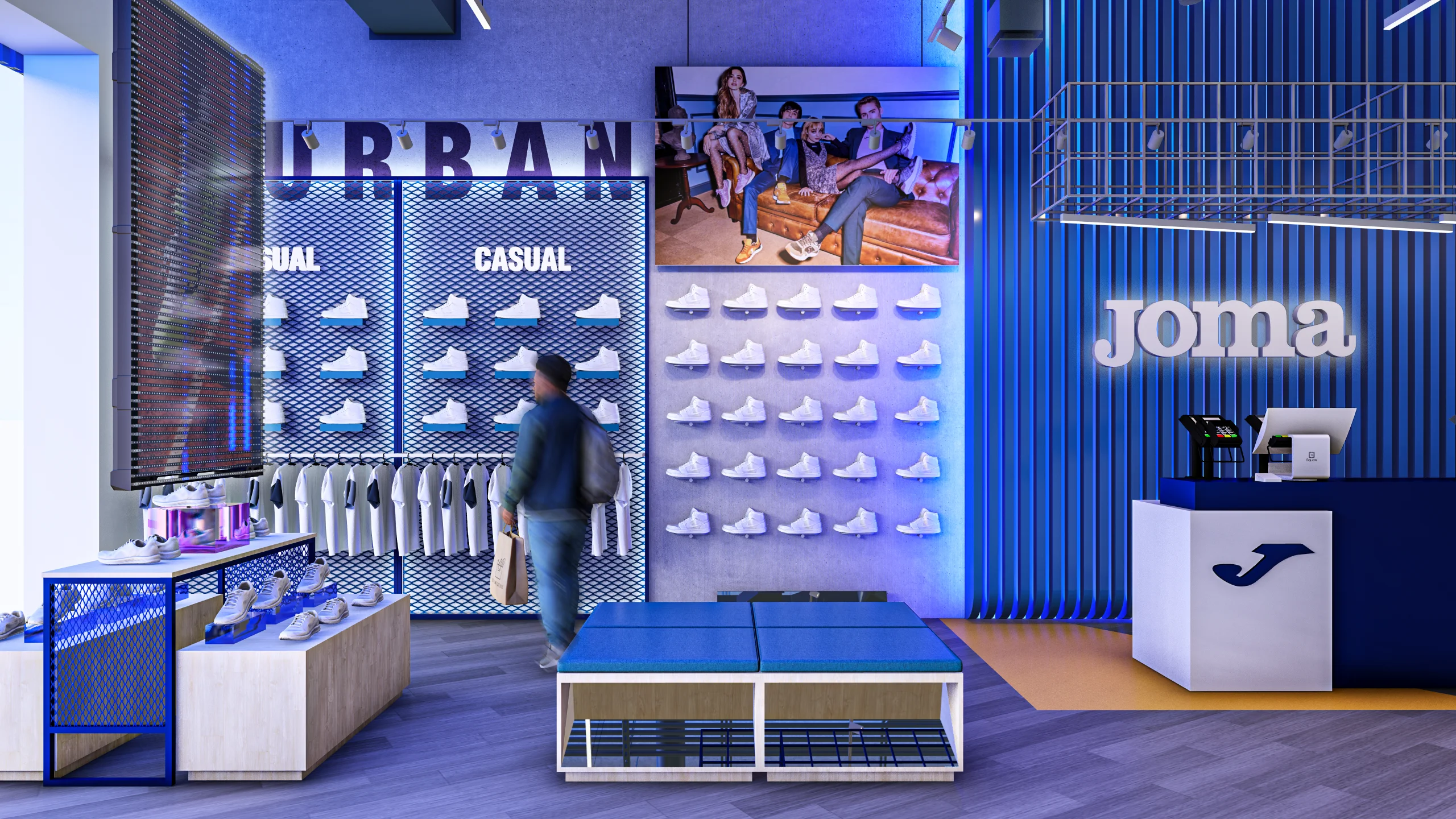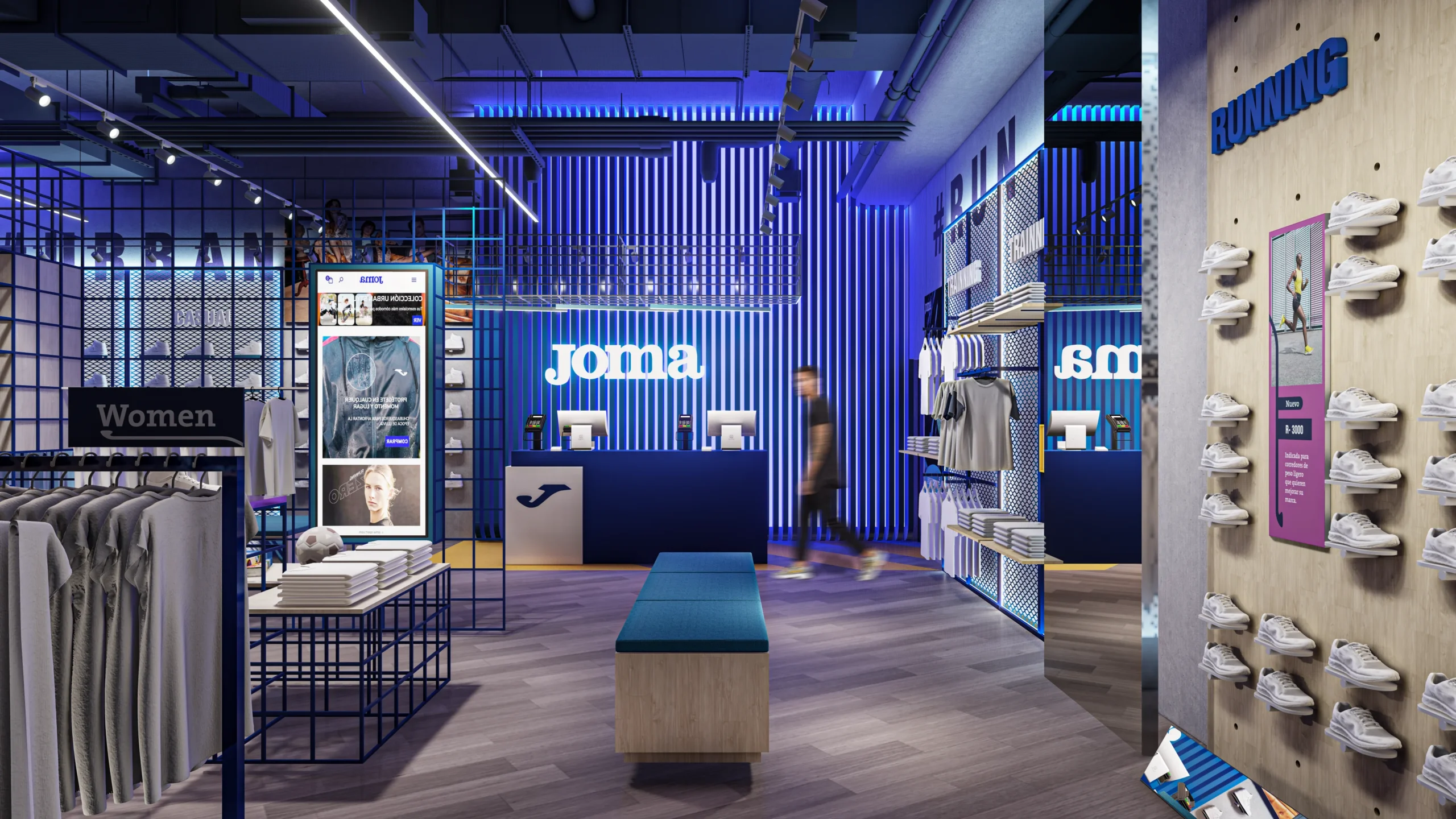 Para lograr que el usuario conecte con la marca, se optó por un diseño tecnológico, tanto a nivel visual como de experiencia llamado «El mundo Joma». Resaltando herramientas como la iluminación y el uso de pantallas para invitarlos a explorar la tienda, la trayectoria de la marca y activar su curiosidad desde el primer contacto.